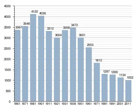 في سنة 1861 بلغ عدد السكان 3٬367 نسمة، وتطور العدد ليصل في سنة 2011 لـ 1٬002 نسمة.