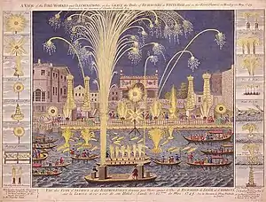ترافقاً مع انتشار نزعة الزخرفة الصينية في أوروبا أواسط القرن السابع عشر، بدأ وجود الألعاب النارية يصبح مألوفاً،[11] إذ كان أوّل ظهوره محطّ إعجاب من الناس، فقد ورد على لسان ليف إزمايلوف سفير بطرس الأكبر في الصين قوله: «إنهم يصنعون ألعاباً نارية بالشكل الذي لم يره أحدٌ في أوروبا قطّ».[11] نشر أميدي-فرانسوا فريزييه أطروحته المراجَعَة عن الألعاب النارية Traité des feux d'artice pour le spectacle سنة 1747،[12] واصفاً فيها استخدام الألعاب النارية لأغراض التسلية والمراسم الاحتفالية. وفي سنة 1749 ألّف الموسيقار جورج فريدريك هاندل مقطوعة موسيقى الألعاب النارية الملكية للاحتفال بمعاهدة إيه لاشابيل (معاهدة آخن).