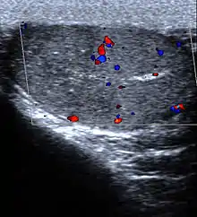 الموجات فوق الصوتية والتي يمكنها الكشف عن تشوهات مثل سرطان الخصية. في حالة انفتال الخصية، يكشف الفحص بالموجات فوق الصوتية الدوبلر الملون انخفاض أو غياب تدفق الدم إلى الخصية.