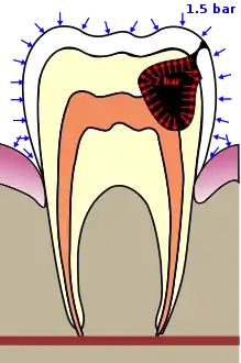 في بعض الأحيان، يؤدي الضغط إلى تدمير الأسنان (بدلًا من مجرد التسبب في الألم). عندما يرتفع أو ينخفض الضغط الخارجي ولا يمكن للهواء المحاصر داخل الفراغ أن يتوسع أو يتقلص من أجل موازنة الضغط الخارجي، يمكن أن يؤدي فرق الضغط على الهيكل الصلب للسن أحيانًا إلى إجهادات كافية لكسر السن أو اقتلاع الحشوات.[15] عادة ما يُشاهد هذا عند الغواصين[4] تحت الماء أو الطيارين[16] الذين يعانون من تغيرات الضغط في سياق نشاطهم. تحديد الألم أثناء تغيير الضغط هو مؤشر تشخيصي للطبيب. يشتمل العلاج على إزالة الفراغ عن طريق استبدال الترميمات الشئذة بعناية، وتكرار العلاج اللبي أو قلع السن.[17]