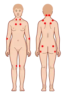 - النقاط الحساسة- تم تعيين 18 نقطة حساسة ممكنة (هذا لاينفي إمكانية الشعور بالألم في مناطق أخرى). التشخيص لم يعد يعتمد على عدد المناطق الحساسة.[91][92]