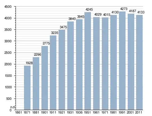 في سنة 1871 بلغ عدد السكان 1٬928 نسمة، وتطور العدد ليصل في سنة 2011 لـ 4٬133 نسمة.