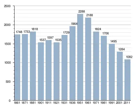 في سنة 1861 بلغ عدد السكان 1٬748 نسمة، وتطور العدد ليصل في سنة 2011 لـ 1٬082 نسمة.