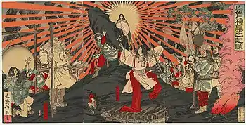 أثناء "فترة مييجي" وحتى الآن الرواية الرسمية تقول إنَّ الإمبراطور -وجميع أباطرة اليابان- ينحدرون من صلب آلهة الشمس أماتيراسو.