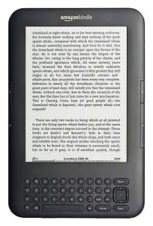 |CitationClass=تم تجاهله (مساعدة)[بحاجة لتوضيح] - http://www.amazon.com/Wireless-Reading-Display-International-Generation/dp/B0015T963C/ref=amb_link_85647731_3؟pf_rd_m=ATVPDKIKX0DER&pf_rd_s=gateway-center-column&pf_rd_r=0RAP2NN7T66JNR11SJJT&pf_rd_t=101&pf_rd_p=493724391&pf_rd_i=507846 نسخة محفوظة 14 مارس 2020 على موقع واي باك مشين.