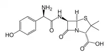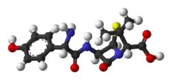 ![]() التركيب الكيميائي ![]() مجسم التركيب أموكسيسيلين (بالإنجليزية: Amoxicillin) هو عقار ينتمي إلى فئة من العقاقير تسمى مضادات حيوية مشابهة للبنسلين. يستعمل لمعالجة الاصابات التي تسببها أنواع معينة من البكتيريا. فهو يعمل من خلال وقف نمو البكتيريا. وهو مضاد حيوي متوسط الطيف، من صنف مضادات البيتالاكتام. هو ذو أفضلية على غيره من أدوية هذا الصنف لأنه يمتاز بامتصاص أفضل من الجسم عند التعاطي بالفم. أموكسيسيلين هو المضاد الحيوي الأكثر استخداماً للأطفال. أموكسيسيلين معرّض للتثبيط بواسطة البكتيريا المنتجة للبيتالاكتاميز المقاومة للمضادات الحيوية واسعة الطيف مثل البنسيلين، ولهذا يتم مزجه غالبا مع مثبط للبيتالاكتاميز (بالإنجليزية: beta-lactamase) كحامض الكلافولينيك المضادات الحيوية بشكل عام لا تصلح لعلاج نزلات البرد، والإنفلونزا، وغيرها من العدوى الفيروسية. فالأموكسيسيلين يستخدم لعلاج بعض الالتهابات التي تسببها البكتيريا، مثل الالتهاب الرئوي، التهاب القصبات، السيلان، والتهابات الأنف الأذن والحنجرة، والمسالك البوليه، والجلد. يستخدم أيضا مع مجموعة ادوية أخرى للقضاء على البكتيريا التي تتسبب القرحات. نيليسيسكوما هو في فئة من الأدوية تسمى - مثل البنسلين والمضادات الحيوية. انه يعمل من خلال وقف نمو البكتريا. المضادات الحيوية لن تعمل لنزلات البرد، والإنفلونزا، وغيرها من العدوى الفيروسية. الاستخدام الطبيالأموكسيسيلين يستخدم لعلاج عدد من الأمراض المعدية: التهاب الأذن الوسطى الحاد، التهاب البلعوم بالعقيديات، التهاب الرئة، الالتهابات الجلدية، التهابات المسالك البولية، السلمونيلة، داء لايم وعدوى المتدثرة.[3] تستخدم كذلك للحيلولة دون وقوع التهاب الشغاف الجرثومي في الأشخاص أصحاب الاختطار المرتفع الذين يعالجون أسنانهم للوقاية دون عدوى العقدية الرئوية عند الذين استؤصل الطحال عندهم. وكذلك للوقاية ولعلاج الجمرة الخبيثة. رغم ذلك فإن المملكة المتحدة لا تنصح باستخدامه للتوقية من التهاب الشغاف العدوائي. لكن يبدو أن هذه التوصيات لم تغير نسبة العدوى. .[4][5] أوصت الإرشادات بالأموكسيسيلين والأموكساسيلين-حمض الكلافيولينيك كأول خيار يجب استخدامه لعلاج التهاب الجيوب الأنفية البكتيري. مع أن معظم التهابات الجيوب الأنفية سببها فايروسي، والمضادات الحيوية غير فعالة مع الفايروسات. أحيانا يستخدم الأموكسيسيلين لعلاج العدوى الجلدية مثل حب الشباب. يستخدم الأموكسيسيلين عادتا لعلاج حالات حب الشباب التي لم تستجيب لمضادات حيوية أخرى مثل الدوكسيسيكلين والمينوسايكلين. .[6][7][8][9] التهاب الأذن الوسطى الحادعادةً ما يُعالج الأطفال المصابون بالتهاب الأذن الوسطى الحاد والذين تقل أعمارهم عن 6 أشهر بالأموكسيسيلين أو المضادات الحيوية الأخرى. على الرغم من أن معظم الأطفال المصابين بالتهاب الأذن الوسطى الحاد والذين تزيد أعمارهم عن عامين لا يستفيدون من العلاج بالأموكسيسيلين أو المضادات الحيوية الأخرى، فقد يكون هذا العلاج مفيدًا للأطفال الذين تقل أعمارهم عن عامين المصابين بالتهاب الأذن الوسطى الحاد الثنائي أو المصحوب بتصريف الأذن.[10] في الماضي، كان الأموكسيسيلين يُعطى ثلاث مرات يوميًا عند استخدامه لعلاج التهاب الأذن الوسطى الحاد، مما أدى إلى فقدان الجرعات في الممارسة الإسعافية الروتينية. ومع تطور العلم والأبحاث وُجد أن الجرعة اليومية مرتين أو مرة واحدة في اليوم تؤدي نفس الفعالية.[11] التهابات الجهاز التنفسيأوصت الدلائل الإرشادية باستخدام أموكسيسيلين وأموكسيسيلين كلافولانات كدواء مفضل لالتهاب الجيوب الأنفية الجرثومي والتهابات الجهاز التنفسي الأخرى. تنتج معظم التهابات الجيوب الأنفية بسبب الفيروسات، حيث لا يكون أموكسيسيلين وأموكسيسيلين كلافولانات فعالين( كونهمما مضادين ضد البكتيريا فقط وليس الفيروسات)، وقد يتم تجاوز الفائدة الصغيرة التي يكتسبها الأموكسيسيلين بسبب الآثار الضارة.[12] يوصى باستخدام أ