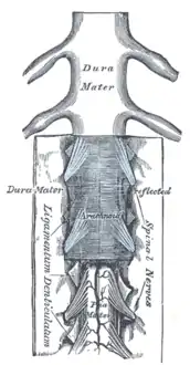 ![]() رسم تخطيطي لمقطع عرضي في النخاع الشوكي وأغشيته. (الأم الجافية الخط الأسود، الأم العنكبوتية الخط الأزرق، الأم الحنون الخط الأحمر.) | |