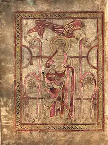 تحتوي المخطوطة على صورتين مبشرين (القديس مرقس وسانت لوقا) ؛ صفحة سجادة ، تشبه إلى حد كبير تقنية عمل Eadfrith [[[|of Lindisfarne?]]] أنه ينبغي أن يعزى إليه ؛ صفحات محورية لماثيو ( Lib of Liber ) ومارك ( Ini of Initium ) و Luke ( Q of Quoniam ) ؛ صفحة أحادية تشي تشي ، وصفحة مع أربعة رموز من المبشرين . لسوء الحظ ، فإن صفحة ماثيو التمهيدية تُلبس بشدة ، ويبدو أنها كانت بمثابة الغلاف الأمامي للمخطوط لعدة سنوات. يتضمن إنجيل ماثيو أربع صفحات مؤطرة: أنساب المسيح (3 صفحات) وصفحة ماثيو الأخيرة.