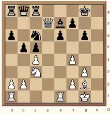 بعد 18 نقلة من الإفتتاح الإنجليزي ألت الوضعية إلى الموقف في المخطط الجانبي .يستفيد الأبيض من دور النقل إلى جانبه ويضحي بالرخ[ ر:e6!!]