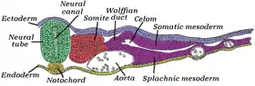 ![]() المقطع يستعرض نصف الجنين في حضانة ال45 ساعة. حيث يضهر سطح الظهر (الخلفي) من الجنين نحو الجزء العلوي من هذه الرسمة، في حين أن السطح البطني (الأمامي) فإنه يتجه نحو القاع. (الأنبوب العصبي باللون الأخضر.).) | |