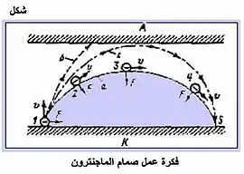 تعتمد فكرة عمل الماجنترون بصفة أساسية على تبادل الطاقة بين سيل الإلكترونات المتحركة في وجود مجال كهربائي ومجال مغناطيسي متعامدين وبين موجة كهرومغناطيسية محددة التردد الأمر الذي يرفع طاقة تلك الموجة إلى المستوى المطلوب (اُنظرالشكل ) . الإلكترونات تنطلق من سطح الكاثود K إلى سطح الأنود A تحت تأثير مجال كهربائي اتجاهه من K إلى A في نفس الوقت يقع الإلكترون أثناء حركته تحت تأثير المجال مغناطيسي لمغناطيس في شكل حدوة الحصان يحيط بالكاثود والأنود (المجال المغناطيسي عمودي على مستوى الرسم واتجاهه إلى داخل الرسم). الإلكترونات تتعرض لقوة تجعلها تتخذ مساراً منحنياً طبقاً للعلاقة بين شدة المجال الكهربائي والمغناطيسي، فبعضها تتبدد معظم طاقته عند الاصطدام بالسطح K وبعضها يرتطم بالسطح A ومعظم طاقته تتحول إلى طاقة حرارية ترفع درجة حرارة السطح A (تأثير غير مرغوب ويحتاج تبريد ). وبعضها الأخر يتحرك في مسار متوسط ويقترب أقرب ما يكون مماس للسطح A ويعطي كل طاقته إلى المجال المغناطيسي. نقل طاقة الإلكترون إلى المجال المغناطيسي الواقع بين السطحين K، A يؤدي إلى تكبير الموجة الكهرومغناطيسية بنفس مقدار طاقة الإلكترونات المتحركة بين السطحين.