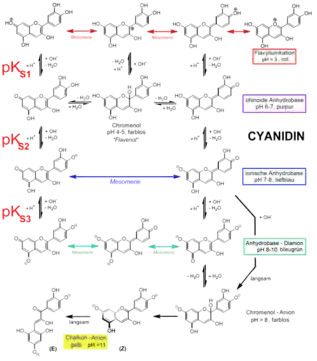 استقرار الأنثوسيانيدين يعتمد على الأس الهيدروجيني. عند أس هيدروجيني منخفض (الظروف الحمضية)، توجد الأنثوسيانيدينات الملونة، بينما في الأس هيدروجيني الأعلى (الظروف القاعدية) تكون أشكال الكاليكون عديمة اللون.