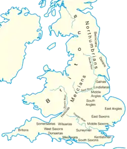 سيطر الأنجلوسكسونيون على أغلب بريطانيا، لكنهم لم يفتحوا اسكتلندا وويلز وكورنوال. قسموا البلاد إلى ممالك، كان لكل منها عائلته المالكة الخاصة. سيطرت الممالك الأقوى على الممالك الأضعف في أغلب الأحيان. مع حلول العام 600، كانت الممالك الأنجلوسكسونية الرئيسية السبع هي: نورثمبريا، ومرسيا، ووسكس، وكنت، وأنكليا الشرقية، وسوسكس، وإسكس. كان ملك ميرسيا في القرن 8 يدعى أوفا. قام ببناء وخندق حائط أرضي طويل اسمه "خندق أوفا" على حدود ويلز حتى يبعد القبائل الويلزية عن مملكته.