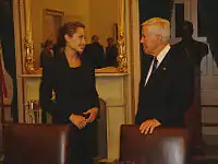 ![]() جولي في مؤتمر القمة العالمي لإنهاء العنف الجنسي في النزاعات في 2014 | |