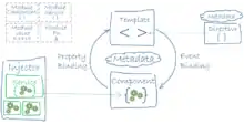 - لا تمتلك Angular مفهوم "النطاق" أو وحدات التحكم، وبدلاً من ذلك تستخدم التسلسل الهرمي للمكونات كخصائصها المعمارية الأساسية.[4]