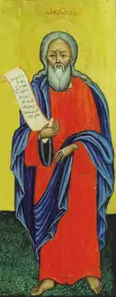 ![]() أيقونة القديس أندراوس يحمل بيده لوحة عليها طروبارية القديس | |
