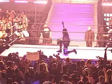 - يرمي خصمه خارج الحلبة ويضرب في الحبال ويقفز عليه إذا نفذ حركة الانتحار