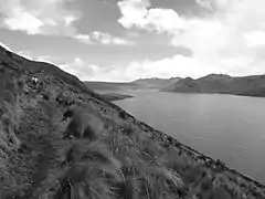 صورة بالأبيض والأسود لبحيرة في جبال الأنديز