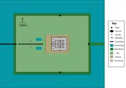 يقع المعبد على أرض أكثر ارتفاعاً من المدينة، ويتكون من ثلاثة أروقة مستطيلة الشكل ترتفع إلى البرج المركزي، وكل مستوى من الأروقة أكثر ارتفاعاً من الآخر. تفسر مانيكا هذه الأروقة بأنها مكرسة إلى الملك وبراهما والقمر وفيشنو. كل رواق له بوابة في كل جهة، وكلا الرواقين الداخليين يحتويان على أبراج في أركانهم مكونة شكل مربع يتوسطه البرج المركزي. وتتجه جميع معالم المعبد إلى الشرق تاركه مساحة أكبر للملء في كل سياج ورواق في الجهة الغربية؛ وبرجع ذلك إلى توجه المعبد بذاته إلى الغرب. وينتج عن ذلك أيضاً أن السلالم التي تواجه الغرب أقل عمقاً من السلالم في الجهة الأخرى.