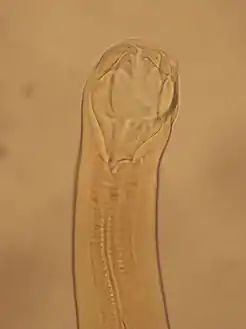 تلتصق الدودة بجدار الأمعاء الدقيقة للإنسان بواسطة هذه الأسنان والزوائد وتمزقه لتمتص الدم مسببة له فقر دم شديد.