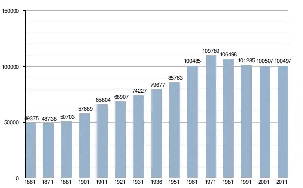 في سنة 1861 بلغ عدد السكان 49٬375 نسمة، وتطور العدد ليصل في سنة 2011 لـ 100٬497 نسمة.