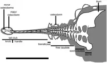 وقد كانت هراوة ذيل الأنكيلوصور الشهيرة كذلك تتألف من العديد من الجلود العظمية الضخمة التي كانت تلتحم بـفقرة الذيل. كما كانت ثقيلة ومدعّمة بآخر سبع فقراتٍ في الذيل التي تشابكت مُكَونةً قضيبًا قويًا في قاعدة الهراوة. وبالنسبةِ إلى الأوتار المتصلة بتلك الفقرات، فقد تم حِفظها. وقد كانت هذه الأوتار متحجّرة (أو عظمية) بشكلٍ جزئي ولم تكن مرنة للغاية، مما يسمح بانتقال قوة كبيرة إلى نهاية الذيل حين يتأرجح. ويتضح أنها كانت سلاحًا دفاعيًا فعّالاً قادرًا على إحداث أثر مدمِّر يكفي لكسر عظام المهاجم.[4] أظهرت دراسة في عام 2009 أن" نتوءات الذيل كبيرة الحجم قادرة على إحداث قوة كافية لكسر العظام أثناء التصادمات، بينما لا تقوى النتوءات الصغيرة والمتوسطة على إحداث ذلك"، وأن "سلوك أرجحة الذيل محتمل حدوثه عند ديناصورات الأنكايلوصوريدس (ankylosaurids) ولكنه لا يزال غير معروف ما إذا كانت تستخدمه كوسيلةٍ لدفاع داخلي معين أو لصراع خارجي محدد أو لكليهما".[6] وجرى الافتراض بأن هراوة الذيل كانت تستخدم كشركٍ للرأس ولكن هذه الفكرة فقدت مصداقيتها الآن إلى حدٍ كبير.[7]