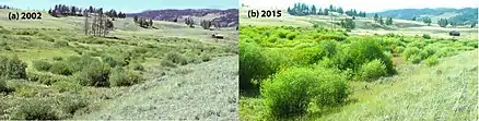أدت إزالة الذئب الرمادي من منتزه يلوستون الوطني إلى تأثيرات كبيرة على الهرم البيئي. بدون وجود المفترسات بدأت الحيوانات العاشبة القضاء على العديد من أنواع الأشجار مما أدي إلى تقليل مساحة الأرض المزروعة. بالإضافة إلى ذلك فإن الذئاب عادة ما كانت تمنع الحيوانات العاشبة من الرعي في مناطق ضفاف الأنهار، مما حمى القنادس من استهلاك مصادر غذائهم. إزالة الذئاب أدت إلى تأثير مباشر على أعداد القنادس حيث أصبحت أماكن سكنهم مناطق رعي. زيادة الرعي على شجر الصفصاف والصنوبر على طول بلاكتيل كريك بسبب انعدام الحيوانات المفترسة أدى إلى شق القناة، لأن القنادس كانت تساعد في إبطاء سرعة المياه مما كان يسمح للتربة بالثبات في مكانها. علاوة على ذلك فإن الحيوانات المفترسة ساعدت على السمات المائية مثل الجداول ومجاري المياه على العمل بصورة طبيعية. عندما تم إدخال الذئاب ثانية تعافت أعداد القنادس وكامل النظام الحيوي على ضفاف الأنهار بصورة كبيرة في غضون بضعة سنوات.[14]