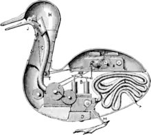 1738: بناء الآلي وبدأ في غرونوبل، فرنسا بواسطة جاك دي فوكانسون، لاعب الناي الأول يمكن أن يعزف اثنا عشر أغنية -لاعب الناي، متبوعا بلاعب على الناي والطبل أو الدف- لاعب الدف، يتضمن مع الحركة / الوقوقة / ضرب / اكل البط - البطة الهاضمة.[11]