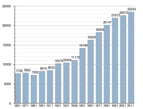 في سنة 1861 بلغ عدد السكان 7٬729 نسمة، وتطور العدد ليصل في سنة 2011 لـ 23٬543 نسمة.