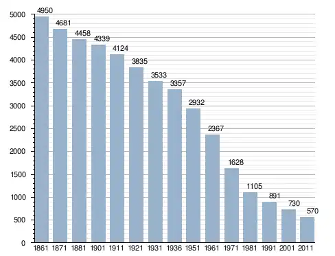 في سنة 1861 بلغ عدد السكان 4٬950 نسمة، وتطور العدد ليصل في سنة 2011 لـ 570 نسمة.