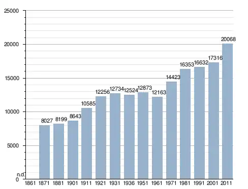 في سنة 1871 بلغ عدد السكان 8٬027 نسمة، وتطور العدد ليصل في سنة 2011 لـ 20٬068 نسمة.