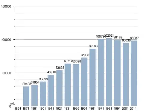 في سنة 1871 بلغ عدد السكان 29٬425 نسمة، وتطور العدد ليصل في سنة 2011 لـ 98٬287 نسمة.