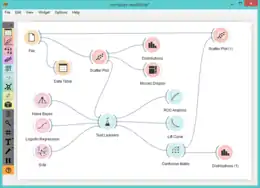 Orange وهي عباره عن حزمة برمجية تعتمد على المكونات البرمجية لتصوير البيانات والتعلم الالي واستخراجها وتحليلها.