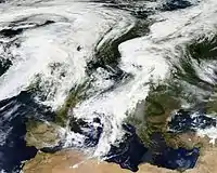 تتسبب الرياح التي تهب عبر القارة من المحيط الأطلسي في تلطيف المناخ في أوروبا. إذ تتأثر هذه الرياح بتيار الخليج الدافئ، وهو تيار محيطي قوي، يجرف الماء الدافئ من خليج المكسيك إلى ساحل أوروبا الغربي وامتداده الشمالي، ويسمى بتيار المحيط الأطلسي الشمالي.[112] يتأثر معظم القارة بهذه الرياح الغربية لعدم وجود حاجز جبلي بالحجم الذي يمكن أن يعترضها، ونسبة لأن معظم أوروبا يقع في حدود 480كم من المحيط الأطلسي.[112]