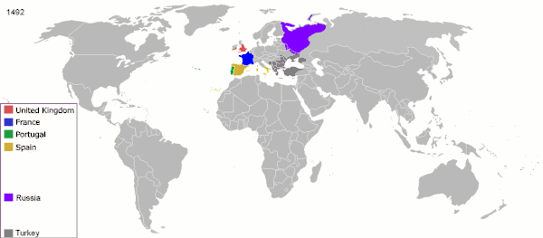 أستولت الإمبراطورية الإسبانية على قارات أمريكا الوسطى والجنوبية وقارة أفريقيا وجنوب شرق آسيا لأجل تأسيس إسطول كبير فهي تعد أول إمبراطورية إستعمارية في تاريخ العالم.[80] وقد إقتدت إمبراطورية هولندا الإستعمارية بإمبراطوريات البرتغال وإسبانيا الإستعمارية. وقد أسس الهولنديون مستعمرات في أمريكا الشمالية وأمريكا الجنوبية وأفريقيا وجنوب شرق آسيا. وكانت إنجلترا حتى عام 1588 أضعف بكثير من تلك الدول. وضعت إليزابيث الأولى ملكة المملكة المتحدة أسس الإمبراطورية البريطانية من خلال إلحاق الهزيمة بالأرمادا الأسبانية الذي تعد أقوى أسطول بأوروبا في عام 1588.[81] وهكذا فقد انتهت الهيمنة الأسبانية على المستعمرات الأمريكية، وبعد هذا التاريخ إستولت القوات الهولندية والإنجليزية واحداً تلو الأخر على المستعمرات التي توجد في أميركا. أما فرنسا فقد تركت كل مستعمراتها في أمريكا الشمالية لإنجلترا بمعاهدة باريس والتي ابرمت في نهاية حرب الاعوام السبع بتاريخ 1763. وهكذا فقد استولت إنجلترا على كل المستعمرات التي توجد في أمريكا الشمالية. وقد تأسست مملكة بريطانيا العظمى من خلال توحيد إنجلترا واسكتلندا في عام 1707. وقد أسست المملكة المتحدة البريطانية والإيرلندية العظمى من خلال ضم إيرلندا لهذا الاتحاد في عام 1800. أصبحت المملكة المتحدة في العصر الفيكتوري ما بين اعوام 1837-1901 إمبراطورية لا تغرب الشمس عنها.[82]