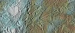أوروبا سطح جليدي ممتلئ بمجموعة معقدة من الخنادق والأخاديد والجروف، وتتركز هذه الخطوط المتشابكة قرب خط الاستواء، كما يلاحظ ندرة الفوهات النيزكية. تبلغ المسافة الوسطية بين الأخاديد المتوازية حوالي 1 كيلومتراً. ويلاحظ اللون القاتم في أعماق هذه الأخاديد، والذي قد يشير إلى أن الماء الوسخ قد تدفق يوماً من المحيطات العميقة ليصل إلى هذه الأخاديد ويتجمد فيها. ورغم ذلك فإن العلماء لا يزالون يحاولون معرفة المنشأ الحقيقي لهذه المظاهر الجيولوجية المختلفة على أوروبا.