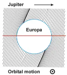 عندما يقترب من المشتري فان المد[؟] فيه يرتفع إلى حد كبير جدا مقارنة بالوضع الذي يكون عليه عندما يكون بعيدا عن المشتري وهذه الحركات المدية ترفع وتخفض الماء تحت المحيط وتتسبب في ظهور تشققات في السطح الجليدي ويدل اللون البني أو الأسمر على وجود مواد ملوثة معدنية نشرها بخار الماء المتحرر من أسفل القشرة الجليدية كما انها تسبب زيادة في درجات الحرارة أعلى من المعدل المفروض حيث أنه يبعد عن الشمس أكثر من بعد الشمس عن الأرض بخمس مرات وهذه الحرارة في المحيط السائل قد تكون جو مناسب لاستمرار حياة بدائية إن وجدت المد[؟] وجزر يولد حرارة إن هذه التأثيرات تكون أعمق ما يمكن على القمر أيو[؟] الذي هو أقرب إلى المشتري، إذ ترتفع درجة الحرارة الداخلية إلى درجة انصهار الصخر، مقوية النشاطات البركانية المتواصلة. ولكون أوروپا أكثر بعدا فإنه يسخن بدرجة أقل، لكن الحسابات الأخيرة تشير إلى أنه قد يمكن الحفاظ على داخله دافئا بما يكفي لصهر الجليد بالأسفل على عمق يتراوح ما بين 15 و 30 كيلومترا، وبالتالي للحفاظ على محيط شامل تحت سطحي. هذا القمر هو المكان الوحيد في النظام الشمسي إضافة إلى أرض الذي يوجد به الماء في حالته السائلة وبكميات مهمة وهذا الفرق يتجلى بشكل واضح في الصورة التي ادرجها سامر لاقمار جاليليو الاربعة كما تتأثر بلورات الجليد البيضاء والزرقاء عبر سطح "أوروبا"، ولعل ذلك راجع إلى قوة اصطدام الكويكبات به، وربما كانت هي التي أتت بالمركبات العضوية إلى هذا القمر