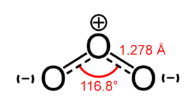 وفقُا للأدلة التجريبية من التحليل الطيفي بالموجات الدقيقة، فإن الأوزون هو جزيء منحن، مع تناظر جزيئي C2v (مماثل لجزيء الماء). مسافات O - O هي 127.2 بيكومتر (1.272 أنغستروم). زاوية O - O - O هي 116.78 درجة.[22] يتم تهجين الذرة المركزية sp² مع زوج واحد وحيد. الأوزون هو جزيء قطبي له عزم ثنائي القطب قدره 0.53 ديباي.[23] يمكن تمثيل الجزيء على هيئة رنين مع بندين مساهمتين، لكل منهما رابطة واحدة على جانب واحد ورابطة مضاعفة من جهة أخرى. يحتوي الترتيب على رتبة رابطة 1.5 لكل من الجانبين.