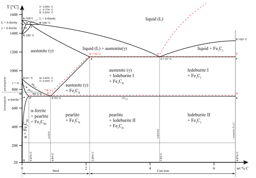 تصل أعلى ذوبانية للكربون في الأوستنيت 2.0% وذلك عند درجة حرارة °1148 والمدرجة في مخطط الحديد والكربون.