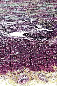 ![]() صورة مجهرية تُظِهر ام الدم الصدرية. وتظهر ايضاً الغلالة الظهارية باللون الأصفر وأوعية العروق. | |