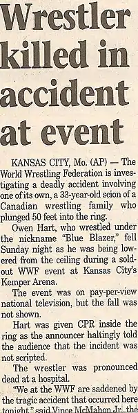 |CitationClass=تم تجاهله (مساعدة) - Ottawa Sun. "Owen Hart's death rocks wrestling world". Slam! Wrestling. Canoe.com. اطلع عليه بتاريخ 11 يناير 2008. الوسيط