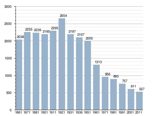 في سنة 1861 بلغ عدد السكان 2٬038 نسمة، وتطور العدد ليصل في سنة 2011 لـ 527 نسمة.