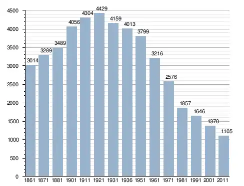 في سنة 1861 بلغ عدد السكان 3٬014 نسمة، وتطور العدد ليصل في سنة 2011 لـ 1٬105 نسمة.