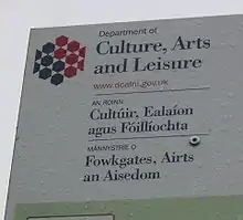 مثال على اللافتات بثلاث لغات باللغتين الإنجليزية والإيرلندية والأولسترية الأسكتلندية.