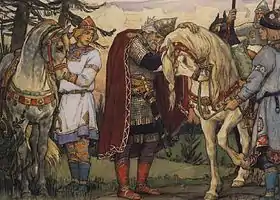 وقول بعض المؤرخين أن أوليغ مات في كييف. أما البعض الآخر فيقول أنه مات خارج البلاد، أي في ما وراء البحار. وثمة أسطورة تروي قصة موته التي تقول أن أوليغ استدعى في يوم من الايام كاهناً ليتنبأ بمصيره، فقال له الكاهن:"موتك من حصانك ". أمر أوليغ بقتل حصانه المحبوب، وندم فيما بعد على ما فعل، فحضر إلى قبر حصانه، وهناك لقي مصرعه جراء لدغة أفعى خرجت من جمجمة الحصان -كما تقول الأسطورة. وأطلق عليه الشعب بعد ذلك لقب أوليغ العراف.