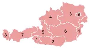 خريطة النمسا مع كل الأراضي الاتحادية المصنفة بالجزء الثاني برمز الأيزو 3166-2.