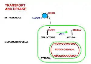 - سلسلة طويلة من الأحماض الدهنية الحرة تدخل خلايا التمثيل الغذائي (أي معظم الخلايا الحية في الجسم باستثناء خلايا الدم الحمراء والخلايا العصبية في الجهاز العصبي المركزي) من خلال بروتينات النقل محددة، مثل عائلة SLC27 لنقل الأحماض الدهنية البروتينية.[4][5] لا تحتوي خلايا الدم الحمراء على متقدرات (ميتوكوندريا) وبالتالي فهي غير قادرة على استقلاب الأحماض الدهنية. أنسجة الجهاز العصبي المركزي لا يمكنه استخدام الأحماض الدهنية للحصول على الطاقة، على الرغم من احتوائه على الميتوكوندريا، وذلك بسبب أن الأحماض الدهنية هذه عبارة عن سلاسل طويلة (وليست من الأحماض الدهنية ذات سلسلة متوسطة [6][7]) لا يمكن عبور حاجز الدم في الدماغ [8] إلى السوائل الخلالية التي تستحم هذه الخلايا.