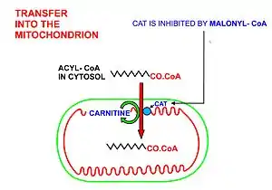 - ليدخل الAcyl-CoA الميتوكوندريون يستخدم المكوك الكارنيتين: [9][10][11] 1- يتم نقل Acyl CoA إلى مجموعة الهيدروكسيل من الكارنيتين بواسطة carnitine palmitoyltransferase I، وتقع على وجوه عصاري خلوي من الأغشية الميتوكوندريا الخارجية والداخلية. 2- يتم نقل Acyl carnitine في الداخل من قبل carnitine acylcarnitine translocase، كما يتم نقل الكارنيتين خارج. 3- يتم تحويل Acyl carnitine إلى Acyl CoA بواسطة carnitine palmitoyltransferase II، وتقع على الوجه الداخلي للغشاء الميتوكوندريا الداخلي. يتم نقل الكارنيتين المحرر مرة أخرى إلى العصارة الخلوية، كما يتم نقلها Acyl CoA في المصفوفة.