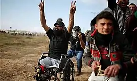![]() إبراهيم رافعًا علامة النصر خلال إحدى الاحتجاجات ضدّ الاحتلال | |