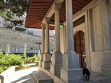 ![]() يقع قبر إبراهيم أدهم باشا في هذه الغرفة الواقعة خارج جامع مهرماه من الجهة اليسرى، ويُرى في الخلف جزء من المدفن المفتوح الواقع أمام ذات المسجد خلف المحراب. |